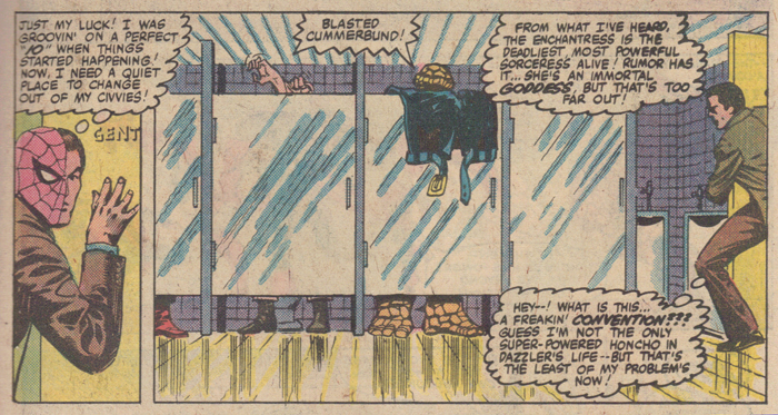 Recently started the entire run of Dazzler (1981-’85) I picked up for cheap on eBay, and the second issue has this awesomely absurd scene. All these male superheroes that have come to the “Numero Uno” disco to hear Dazzler sing crowd into the bathroom to change out of their civvies when the Enchantress attacks. Captain America, Hawkeye, Wolverine, Iron Man Colossus, even the THING (who did not want to ruin the custom tux he was wearing) are all in stalls changing when Peter Parker bursts in to get into his Spidey duds.