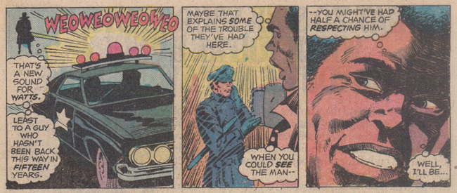 And Black Goliath is no exception. In the very first scene of the very first issue we see BG in his civilian guise, Bill Foster, return to Watts in L.A. where he grew up. He is forced to fight some thuggish black gang members. As I have pointed out before, violence is the way that a superhero character from a marginalized group asserts his belonging. It is violence by one of the “good ones” (Bill Foster is ghetto kid made good—a successful biochemist that heads up Tony Stark’s west coast labs and that has been sought out for scientific help in the past by the Avengers and other superheroes) against the “bad ones” that really indicates that Bill (aka Black Goliath) is a good one. The scene clearly puts the cause of the neighborhood problems onto the community itself. When Foster sees a patrol car goes by he thinks to himself that if cops were around more people in the neighborhood would learn “respect for the Man.” So while on the surface that may seem like it lays the blame on the previous absence of cops, what it really suggests is that unless the people of Watts are closely watched they are prone to commit crime.