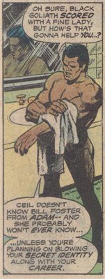 And yet, lest we fear that Foster’s black masculinity is diluted by his acquiescence to “the Man” and his heroic ineptness, he is written with the sexual prowess that reinforces another stereotype. In issue #3, rescued by an African-American flight attendant from nearly drowning in a drainage ditch flooded with water from the firefighters who had to put out the fire that Black Goliath’s fight with Atom-Smasher caused, he beds her with his mask on.