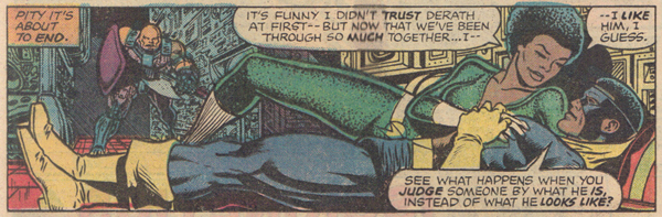 Derath dies, of course, saving Ceil and Black Goliath from Mortag, the big orange dude with an axe you can see int he top left corner of the above panel. This final act cements the green-dude’s friendly nature. Again violence, in this case being willing victim to it, reinforces bonds of belonging.