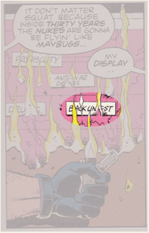 There are two elements to Watchmen that appear to interrogate this absence. First, details in the backgrounds of panels (see inset panel) and supplemental material appended to each chapter (including an apologia for the Klan from the pages of the reactionary New Frontiersman) provides clues to this problem, implying an awareness of this absence on the part of Moore and thus an intentional exclusion. As such, the normitivity of such invisibility is appropriated “to oppose [its] historically sedimented effect, [which] constitutes the insurrectionary moment of that history, the moment that founds a future through a break with the past” (Butler 159). As Watchmen breaks with the superhero comic tradition, it suggests that the tradition it critiques (however well-intentioned) has more in common with the masked and hooded figures responsible for reinforcing racial invisibility through intimidation and violence (i.e. the Klan and serial lynching) than with the liberatory values with which superheroes are popularly associated.