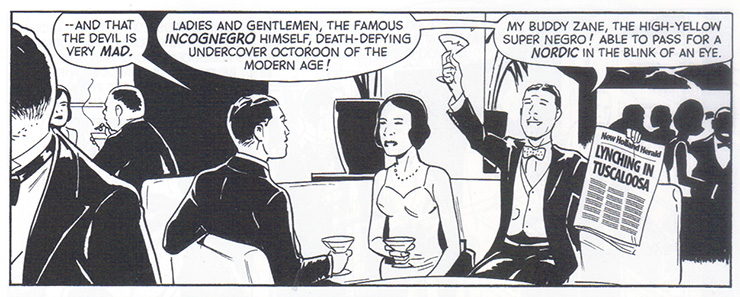 Of course, Incognegro isn’t a superhero comic, but the opening discussion of identity certainly does echo that genre. His friend Carl calls him “Zane, the high-yellow super negro” and Zane, preparing for another trip south narrates, “I don’t wear a mask like Zorro or a cape like the Shadow, but I don a disguise nonetheless.” Unlike a superhero, Pinchback can’t save anyone. He can only observe and report. But perhaps part of my reason that I think of these two comics together is that somewhere between them is a comic I would not only want to read, but follow, buy and support (not that I wouldn’t support Johnson doing more comic work, nor do I mean that comics should be limited to superheroes). The thing about Incognegro is that the seriousness of the topic and the peril of the environment into which the protagonist and his northern friend, Carl (also passing) enter, makes the latter’s attitude about passing hard to swallow. He is just so painfully willing to play at being white and to ignore the dangers to himself and his friend (and unwilling to accept his friend’s wisdom as both a African-American that grew up in the south and who has also passed many times to infiltrate the sites of lynchings) that I have a hard time buying him as a character. Certainly even if Carl had lived his whole life in Harlem and thought of white southerns as dumb yokels, he should have known to fear of those lynch mobs, had some inclination to think back to those “A man was lynched yesterday” signs that were hung from the midtown offices of the NAACP. His comedic attitude towards passing and his wild exaggeration of whiteness (adopting an English accent) may offer some exploration about the socially constructed nature of race and stereotypes, but it does not fit the tone of the rest of the graphic novel—and certainly his final fate is anything but funny. I am not suggesting that it is played for laughs, but rather that Carl’s antics are laughable to the point of undermining my suspension of disbelief.