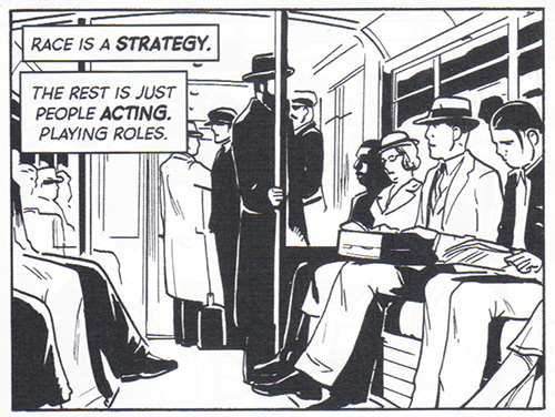 Reading Black Lighting made me think of Mat Johnson and Warren Pleece’s graphic novel Incognegro (2006). The similarity might not be apparent, except for the surface theme of being about black characters, but the approach to passing in both struck me. Typically, racial passing is characterized in terms of individuals taking advantage of the ambiguity of race to gain certain privileges—ranging from marrying into a white family (like Clare in Nella Larsen’s 1929 novella Passing) to just getting a table at the Waldorf-Astoria—but in both these books are in conversation around the use of race and racial passing as a strategy for infiltrating a community to work toward changing it.