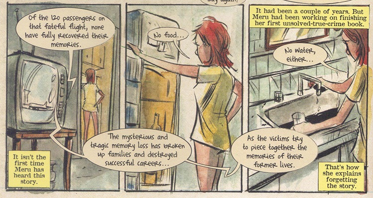 These multiple shifts of perspective in the first couple of pages set the tone for the rest of the series. A blacked-out panel provides the only transition to the “real” story, Flight 815 (a Lost reference–Damon Lindoff wrote the intro for the first collected volume) where all passengers and crew apparently and very suddenly lost all their memories. Two years later they have not regained them.  This disassociation is shared by Meru who “awakens” in her apartment with no food in her fridge, a table full of past due bills and her ”new” idea to write  about the amnesia flight, a follow-up book on her true-crime bestseller.  However, upon calling her literary agent, it appears as if the idea is not as new as it seems to her. Somehow he already knows, but this does not strike her as strange. Sensing something familiar even as she starts a project anew, Meru’s hunt begins to find Henry Lyme, who according to the flight manifest, boarded the plane, but was not among those who got off when it landed.