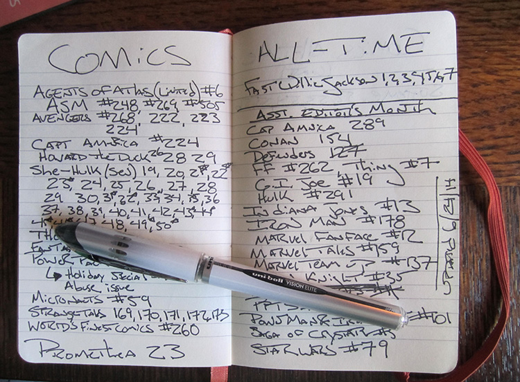 I also love the feeling of excitement that come with researching a reference to a particular comic or creator and I start to hunt around the web and/or ask friends about it. I like figuring out how best to group them in their shortboxes so that series are kept together and are with similar titles—alphabetical within the boxes, but not alphabetical overall, so that She-Hulk can be found in the same box as Fantastic Four and issues of Thing’s solo series and Marvel Two- In-One, and Captain Marvel (Carol Danvers) is in the “Avengers” box with Hawkeye and Agents of Atlas (sure She-Hulk could reasonably be in that box, too—but there is no room and I think of her as a member of the FF more than an Avenger). My experience with characters and titles determines their associations and what counts as “complete.” There is one box for all my DC books (never was a huge fan of their mainstream stuff) and another for all my indie and smaller press comics (as I own most of those in collections, a whole shelf of Love and Rockets, half-a-shelf of Alan Moore’s non-DC output, a growing collection of the Saga trades).