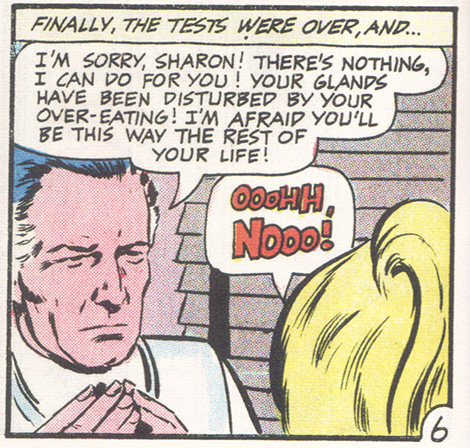 Instead, Weird Love #4 reprints the incredibly titled story, “Too Fat to Frug.”  I can only assume the the play on frug (to suggest “fuck”) was lost on the censor board because this comic has the Comics Code seal on it. In it, sexy go-go dancer Sharon’s inability to control her jealousy drives her man away and leads her to the kind of emotional overeating that “disturb[s]” her “glands” making her permanently fat, losing her dancing gig and the ability to attract any men of quality. “Luckily” for her, a nice chubby guy takes a shine to her, leading to the moral: Even fatties can find love. I mean, I think that is what I am supposed to take from it. Sure, one could read it as a positive body image supporting story, except that her fate is clearly cast as tragic. She’s a loser who has to make the best of her own failure. The story’s less obvious, but no less present, lesson is that if Sharon had learned to control her emotions and not second-guess her man’s ogling another woman, she might not have suffered her embarrassing fatness.