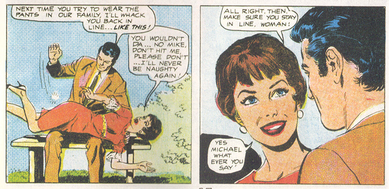Another of my favorite Weird Love stories is, “You’re Fired, Darling” where Doris the office manager is forced to fire her boyfriend, Mike, who is terrible at his job. Despite his anger, he eventually comes to realize what she already knew, that he was a lot more suited to physical labor and working on a construction crew with his uncle, so he comes back to her­—but makes sure to give her a spanking to teach her a lesson her for trying to “wear the pants.” In the end, she expresses her relief to have Mike be “masterful” and take charge, so she doesn’t have to be in the anxious and “unnatural” position she was in as his boss. This kind of submissiveness—for which the women are grateful—is a common conclusion to these stories. Looking back from 2015 this idealizing of such submissiveness becomes a kind of peculiar fetish, as strange to me as the story itself would have us believe is normal for a woman (and man) to want.