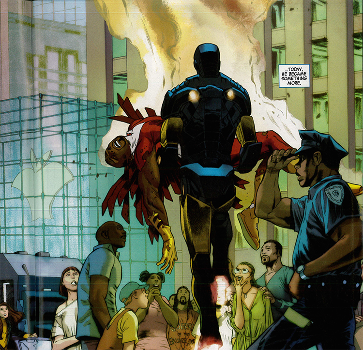 Iron Man carries an assumed dead, Sam Wilson, the Falcon (from Captain America Vol. 4, #24 – Nov 2014)