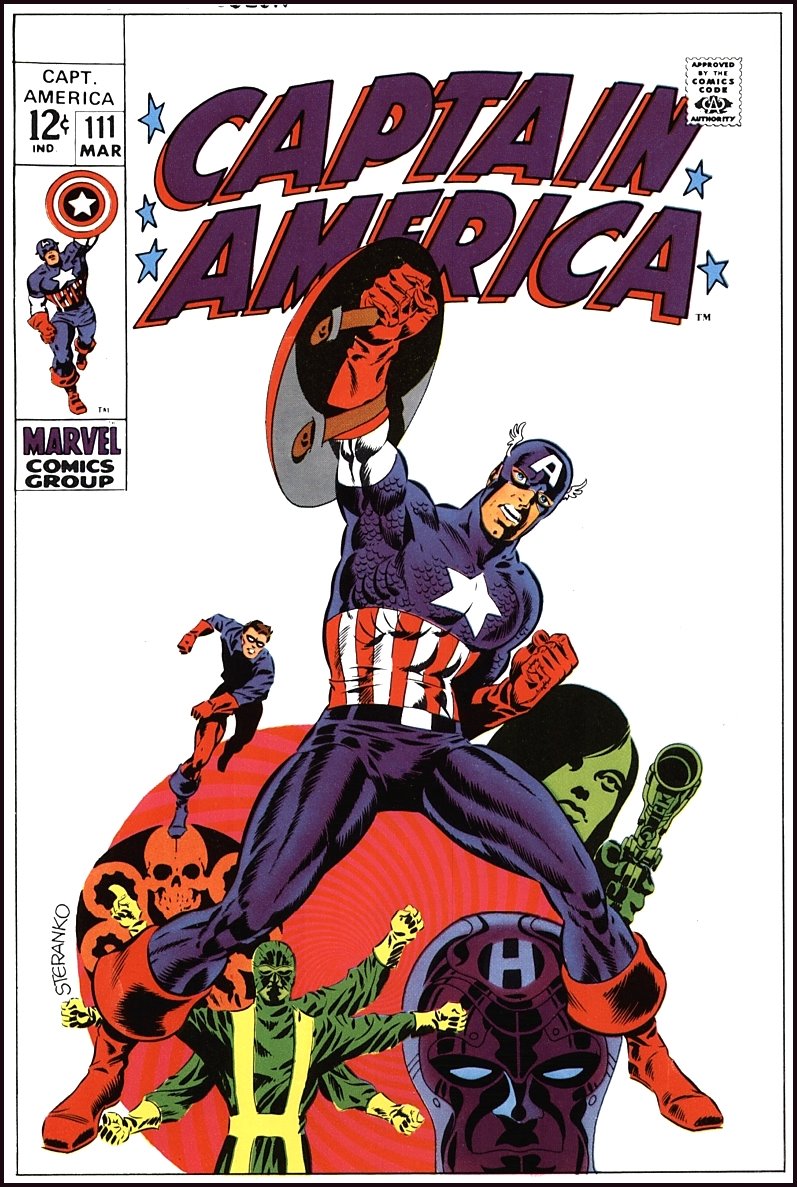 Superhero comic books are driven by color and iconography, notably in the symbolic significance of the superhero costume. That importance cannot be overstated for Marvel’s Captain America, who for me as a comic book collector in the 1970s will always be the Jim Steranko version (above).