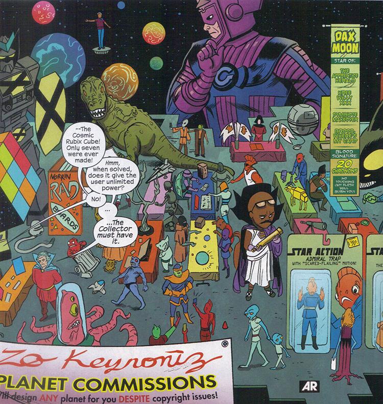 Well, there was one kind of meta moment when the action flashes to the Collector shopping at “Cosmo Con,” a cosmic pop culture convention, where there are celebrity signings and rare collectibles to be acquired, including a life-size “Admiral Trap” action figure (“with scared flailing motion!”), and lots of other jokes in the details. Beneath this 3/5s of a page panel, the silhouettes of Howard and the Guardians flee, as Howard comments “Sounds nerdy.” Meh.