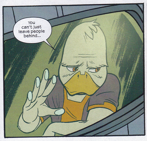 Fingertips on the window are the universal representation of a regretful affect (from Howard the Duck Vol. 5, #2)