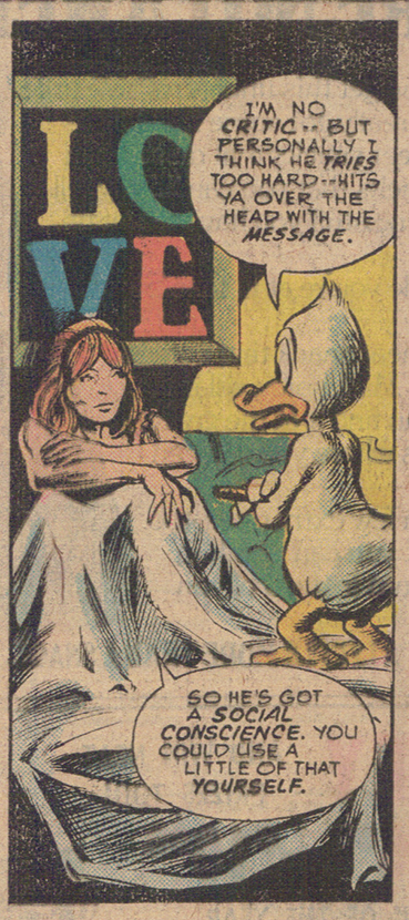 Seeing as you drew attention to that panel of Howard on the bed, Osvaldo, I thought it was maybe worth mentioning that it had been altered after objections from the comics code. The original version can be seen (if you scroll down a bit) at http://www.thegerbercurse.yolasite.com/Chapter_3.php