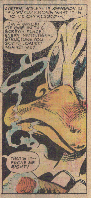 A cosmic turnip obsessed with performing male desire through unwanted sexual contact with a woman. Not cool. But also arguing against the value of popular fiction? (from Howard the Duck Vol. 1, #2)