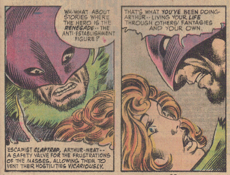 All of this rapey stuff serves as backdrop for the philosophical debate that Arthur and the turnip have as Arthur tries to fight its influence. Through the sexual assault turnip (which sounds like a Cards Against Humanity card), Gerber seems to be exploring and critiquing some of the assumptions of the superhero genre. The turnip mocks Arthur’s dream of heroism, using it cosmic power to manifest the swelling background theme music Arthur dreamed of as part of his heroic fantasy. Meanwhile his body is being used to try to force Beverly into sex, and claiming “There are no heroes, Arthur-Meat — nor villains either. Merely various entities with various desires…when society approves of these desires the entity is deemed good…” It goes on to adopt the Adorno and Horkheimer Frankfurt school attitude towards popular representations of revolution and resistance: “Escapist claptrap…a safety valve for the frustrations of the masses, allowing them to vent their hostilities vicariously.” And then makes his most direct accusation against superhero comics and their readers through the figure of Arthur, “That’s what you’ve been doing, Arthur — living your life through others’ fantasies…”