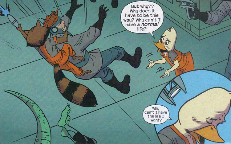 I have to stop here to admit I may be letting my dislike of Rocket Raccoon color my reaction to this comic to some degree. I didn’t like 2014’s Guardians of the Galaxy film either (I found it rather lazy and boring). However, I will say it is against the backdrop of Rocket’s sharp edge and bloodthirsty attitude, like a cute Wolverine, that we get to see the sensitive Duck that makes Howard interesting to me. He takes no pleasure in fighting—complaining when Rocket hands him one of the prison guard’s weapons to use, “Can’t escape guns, man. Even on the other side of the universe. Sheesh”—except of course when he gets caught up in moment, and takes out his outrage at the Collector’s project of holding examples of one-of-a-kind species against their will, he gets a little heated, a little twisted even.
