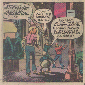 Howard’s penchant to call humans “hairless apes” is rankling when the subject of his barb is African-American (Howard the Duck #3, 1976).