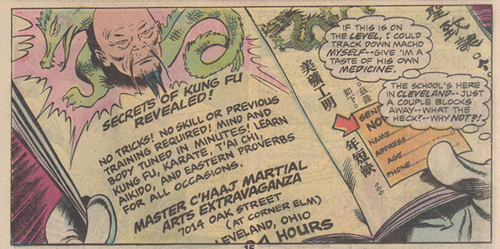 “Four Feathers of Death! Or: Enter the Duck!” begins with Howard and Beverly exiting a movie theater amid a gaggle of young men who—having just seen the same kung-fu flick—are throwing around fake kicks and chops and leaping about yelling “HAI-EEE-TSA!” As kids will do… Howard the Duck is back in cantankerous form, chiding the kids for their games and complaining, “You misrepresent an ancient philosophy, package it as a violent entertainment—and sell it to your young to emulate!” At a diner, Howard continues his rant about portrayals of violence, when kung-fu thugs—led by a guy named Count Macho—throw one of the kids Howard admonished earlier through the window. In the brawl that ensues the kid is stabbed (Gerber seems to suggest that fooling around play-fighting will always lead to serious injury or death) and Howard switches from complainer to reluctant avenger. He seeks out a book on martial arts at a store and the next thing you know he finds an ad, finds a master—of course, the master fits the most retrograde old Chinese man yellow peril stereotype—and Howard’s training montage begins. The big joke in the panel after the montage is that all of that training happened in “three hours and seventeen minutes.” I guess this is supposed to be making fun of how the training montage trope in films actually saps any sense of actually performing hard work over time to achieve a goal. But like a lot of Gerber’s “jokes,” it falls flat.