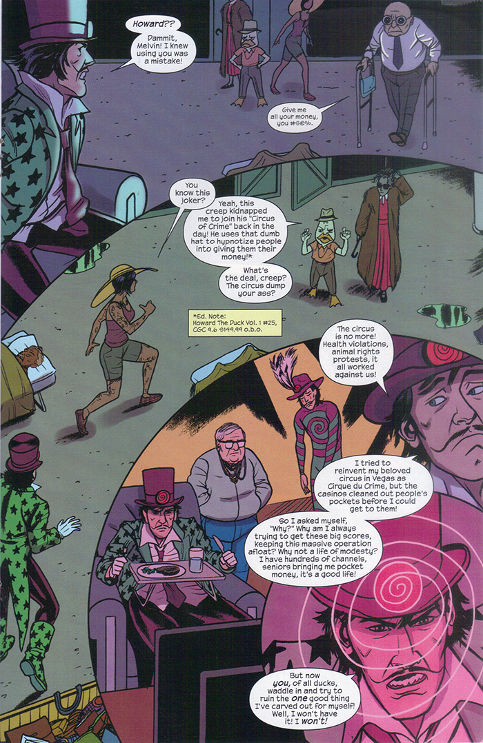 The more recent version of Howard the Duck #3 has lovely colors, but the reversal in the image of a bird clocked on the head with a cane and seeing humans (instead of the old cartoon stand-by of seeing birds) is great, especially since those humans are elderly folks, some with canes and walkers, and perfectly capturing the essence of the story inside.