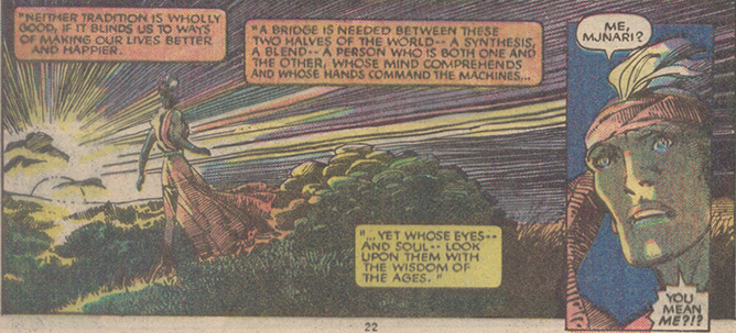 Ororo hears Mjnari’s voice on the plain after his passing: “A bridge is needed between these two halves of the world – a synthesis, a blend – a person who is both one and the other, whose mind comprehends and whose hands command the machines…” Ororo realizes that she is the person Mjnari is talking about. The moment of revelation leads Ororo to claim the whole world as her home, an idea that echoes back to Professor Xavier’s words to her back in Giant Size X-Men #1.