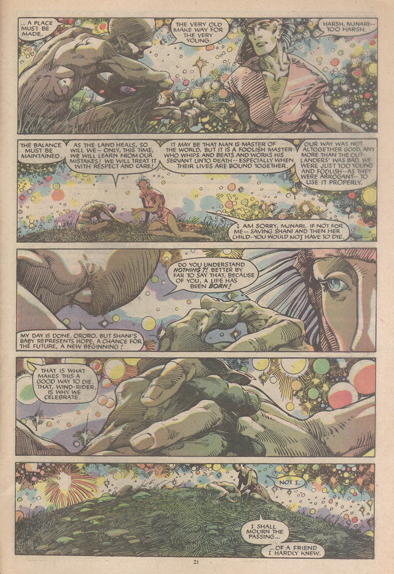 Mjnari is presenting a familiar narrative of the devouring capitalist drive of colonialism, forcing the colonized subject out of a hard, but sustainable, life and into an impoverished one beholden to western powers. At issue’s end, immediately after Shani’s baby is born Mjnari walks out of the village out into the desert, followed by a confused Ororo. It is clear to her that he has come out here to die, and after trying to explain to her about the village’s predicament he does just that—he wills himself to die. I think his death is meant to a noble and selfless act, as the village can only sustain a certain number of people. A new life arrives and old life must leave (though that doesn’t answer how Shani’s presence might also throw the balance out of whack), but Mjnari’s lesson seems couched in an oversimplified notion of the “balance of nature” or his people living in “balance” with their environment, what he describes as necessary for his people to survive and prosper is some middle ground to be found between the forces that sought to exploit this land to maximize its output and the traditions that are now insufficient to maintain even a hardscrabble life in the transformed physical and economic landscape.