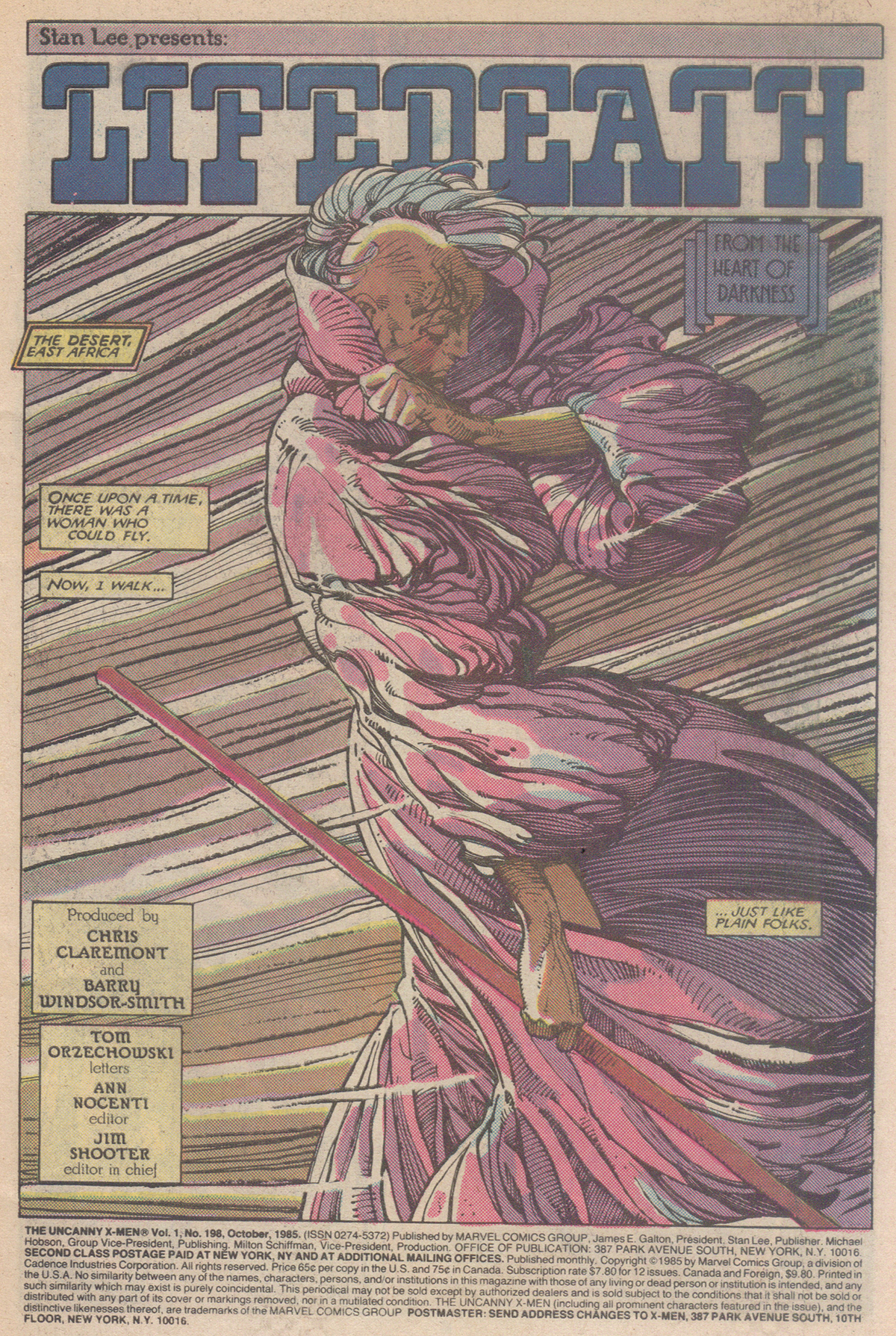 “Lifedeath II” opens with a callback to Uncanny X-Men #186. Between these issues a lot has happened to Storm as she tries to take her leave of absence from the X-Men to do her thing and find herself now that she’s lost her powers. In issue #196 she arrives in Africa only to be shot in the head and left for dead by the von Strucker Twins, the Nazi children of one of Captain America’s many Nazi foes, Baron Wolfgang Von Strucker. “Lifedeath I” opens with Storm lying despondently on a bed in Forge’s high-tech house and the caption reads “Once upon a time there was a woman that could fly…” creating a sharp juxtaposition between her curled up vulnerable form and the power of flight. Issue #198 opens with Ororo trudging through a sandstorm wrapped in a long robe, a bloody wound visible where her mohawk makes her scalp visible. The captions—now narrated by Ororo’s voice—read “Once upon a time there was a woman that could fly. Now, I walk…just like plain folks,” the last part echoing Forge’s sharp words from “Lifedeath I” when he tries to convince her with some tough love to go on living despite her loss of powers. However hard life may seem to her now that she has lost her powers, it is the life that most everyone else must lead.