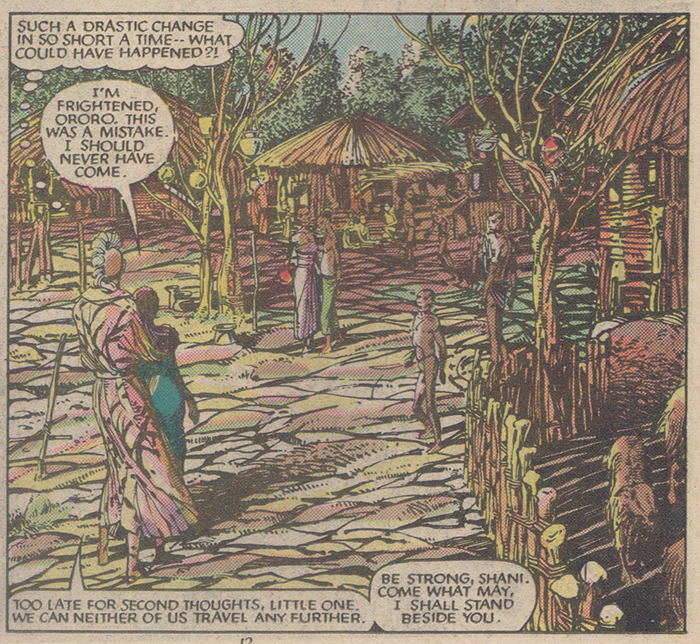 For what it’s worth, Shani’s story is well done. It may verge on cliché, but Claremont does a good job of expressing the varied mix of attitudes and feelings about her choices that you could expect a person to have. She is not a caricature, but she does serve to provide a model for courage that Ororo admires and wants to emulate—one that is entwined with the uncertainty of being human, something that Ororo abandoned in being a goddess and a superhero to her own detriment. As Ororo thinks to herself as she walks Shani back to her village through the night, admiring Shani’s nerve, “What a sham I was! Storm – the paragon of virtue and courage – the goddess who soared above the common herd. Untouched and untouchable!” It is easy to seem brave when you can fly and shoot lightning out of your hands.
