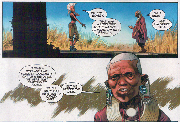 Esther is depicted like a Maasai woman (semi-nomadic people who inhabit Kenya and Tanzania), though there is never any outright reference to them. Esther’s claim however, that at the time that Ororo played goddess they were “just starting to farm” lines up with efforts of the Kenyan and Tanzanian governments to have them adopt a more sedentary lifestyle in the real world. That said, there is not one depiction of cattle (a crucial aspect of Maasai life and culture) in and around Esther’s village, so perhaps the artists took a visual cue from the Maasai without following through with a richer depiction of their life and culture.