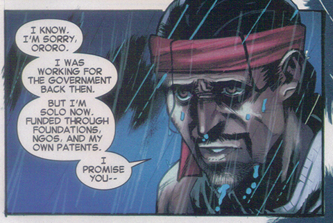 As I suggested above, Pak does a commendable job of trying to address the orientalist notions wrapped up in Storm’s origins. He divorces her from her “goddess” identity and the arrogance, aloofness and superstition that goes along with it. As in the story of “Lifedeath II” (which is reduced here to a one-panel, three-caption reference that gives the reader no sense of the weight of that story), there exists a moment in the incoherent tapestry of X-Men continuity for Ororo to uphold a responsibility to her adopted people and her African origin, but despite her promise to return and check in on Forge’s progress and how things develop, as superhero comic readers we know that this kind of concern will always be secondary. In fact, the placing of this story in a low-selling Storm solo book, rather than in the flagship title as was done in the 80s suggests a lower tolerance in the mainstream for even considering how these issues intersect with Marvel’s narratives.