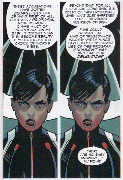 Right away this was so much better than Remender’s run. Like you say it doesn’t go nearly far enough, but it at least has it’s eyes open in the right direction.