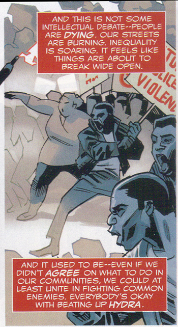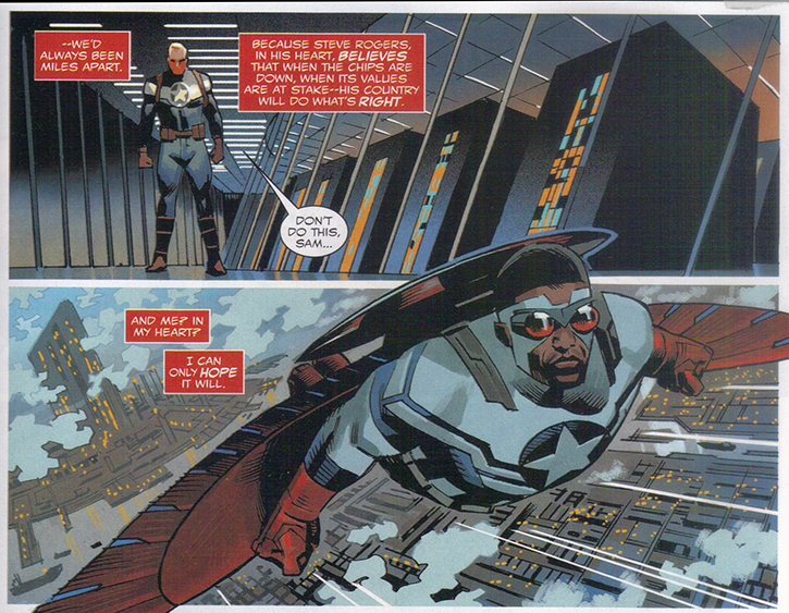 And yet, like Sam, who realizes over the course of the story that the former Captain America, Steve Rogers counts on America to do what’s right “when the chips are down,” people in a marginalized position vis-à-vis the dominant culture can only hope it will, because history has not provided much evidence that the majority will ever do “the right thing” when not forced to. In other words, what should be obvious to the reader, but that the comic does not allow Sam Wilson to say, is that the reason that he and the original Cap, Steve Rogers, have always been “miles apart” is simply because Steve is white and Sam is Black, and America will likely always treat them differently because of this simple fact. It takes righteous people acting against that majority—sometimes alone, but mostly collectively—to show them the depth of American injustice. And yet, we, as readers, deserve a comic series that explores the possibilities of that tempered hope of a better America that comes from never forgetting the dark facts of American history and not giving in to its troublesome myths. If superheroes are supposed to represent the best of what America aspires to—even if, unfortunately, they also represent how its worst inclinations and white supremacist ideals are woven into those aspirations—then even if white America doesn’t want a Black Captain America, a Black Captain America is what it needs.