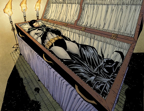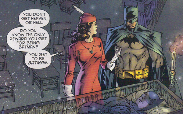 No, what makes a Batman story a Batman story is a range of possible features interacting together. Check out Will Brooker’s excellent book, Batman Unmasked (2000), for an in-depth exploration on variations possible for a continuous and recognizable Batman. “Whatever Happened to the Caped Crusader?” makes its own case (perhaps inadvertently) for what might be necessary to make a given version of Batman actually recognizable as Batman. It does this through a clever take on Goodnight Moon. The spirit of Martha Wayne (Batman’s mother) shows the spirit of the dying Batman a vision of her reading young Bruce his favorite childhood book, counting off some of the elements that make a Batman story—some more important than others. The spirit of Batman and the memory of being read to collapse into the book itself. So he bids goodnight to the mechanical dinosaur and giant penny in the Batcave, goodnight to the Batmobile (this one is 1960s TV iteration), goodnight to Alfred, goodnight to the “boy wonder” (the version depicted is Tim Drake, but could easily be Dick Grayson or Jason Todd), goodnight to the Joker, and to Gotham, and Commissioner Gordon. Finally, he bids goodnight to the Bat-signal shining large and bright like a full moon in the night sky, which, in subsequent panel, morphs into a pair of hands pulling baby Bruce Wayne from the womb to be born into Batman anew. As Martha Wayne explains, the reward for being Batman is getting to be Batman again. Batman cannot die. All that can happen is that one incarnation dies and then the elements of the Bat-story are rearranged and re-imagined to make a new Batman, whether that version be the one first found in Detective Comics #27, or Adam West on TV, in the issues of Batman in the 1970s fighting Ra’s Al-Ghul, or Dark Knight Returns, or Gotham by Gaslight or the version from Earth 2, or the New 52, or…or…or… The notion of being Batman is its own reward—the goddamned Batman, who is a law unto himself and forever badass while doing it—is a central part of his appeal. In other words, the eternal recurrence of the Batman figure reinforces the vicarious thrill of the reader imagining themselves as the hyper-competent superhero who is nevertheless “just a man.” Rather than the adolescent power fantasy put behind us for the pleasures and responsibilities of adulthood, we get a loophole by which to identify with the sociopathic individualist who believes in the rightness of his actions above all others, because as he explains in narration over a montage of scenes from decades of Batman stories—his back broken, shirtless in the desert but still wearing a cowl, making out with Talia al-Ghul, face-to-face with Man-Bat—eventually “every friend betrays me…and every enemy becomes a lover or a friend.” He cannot count on anyone else. Batman is his own moral center.