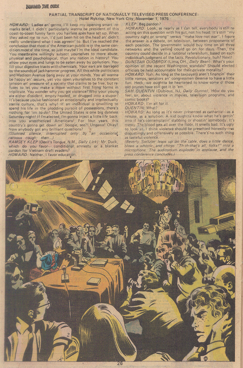 Soon after there is a page with a text transcript of Howard’s press conference, and a large panel inked and colored in a nearly sepia-tone look to evoke flash photograph taken by a news reporter. For a moment I thought it was an ad or a letters page, but instead it was a nice paratextual moment to showcase Gene Colan’s art and Leialoha’s inks. I wish more could be said about the transcript itself, but here Gerber just pens another scene of Howard giving “outrageous” responses to reporter questions on policy. It’s a lot of “Let the people decide” (about amnesty for Vietnam draft evaders) and “Don’t let society tell you who to be!” (because we live in an “emotionally and intellectually sterile culture”). It strikes me of a lot more of the speeches Gerber put in Howard’s beak back in issues two, three and four, and thus boring. I guess the return of the assassins is meant to evoke how ideas like Howard’s threaten the status quo, but they are a better example of the over-simplifications that pass for political discourse today, and thus reinforce the status quo: a trajectory towards complete and utter political bankruptcy, if we aren’t there already. Maybe in the form of a talking duck running for president the absurdity of the so-called populist talking points are meant to be cast as absurd too, but even a talking duck running for president in Marvel Universe is not nearly as absurd as real life characters like Ben Carson and Donald Trump running for president. Trump is America’s “Waldo Moment,” and a comic book duck can’t compete.