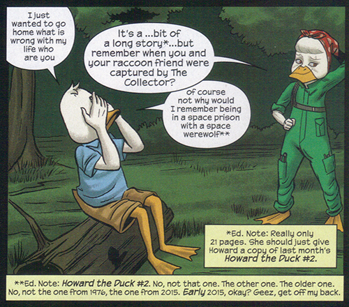 The best part of Howard the Duck vol. 6, #3, is the en media res opening with Howard as a duck version of the Silver Surfer—the entirety of the universe chasing him down in spaceships, seeking his destruction. Caption box narration echoes the comments Howard made in the first issue of this newest volume—as he streaks through space with cosmic power—that he feels as if the universe is out to get him, like he literally doesn’t belong. This scene turns out to be a flash-forward one week, which is not returned to in the issue, but I do look forward to see how the series of events depicted lead to that scenario. Of course, because of the fantastic second issue I am now emotionally invested in the fate of Linda the Duck and Shocket Raccoon, so I am not trying to put the comic down in terms of compelling adventure story with pathos, just in terms of doing something remotely in the tradition that defines the duck.