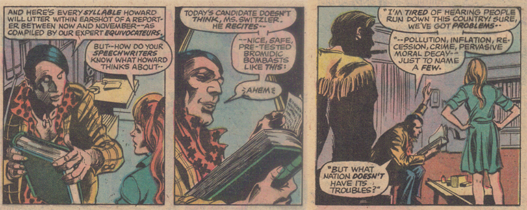 Two panels are all Gerber and Colan need to set the tone in terms of sizing up the presidential candidates representing the dominant parties in American politics in 1976 (from Howard the Duck vol. 1, #8) [Click on image to see full page]