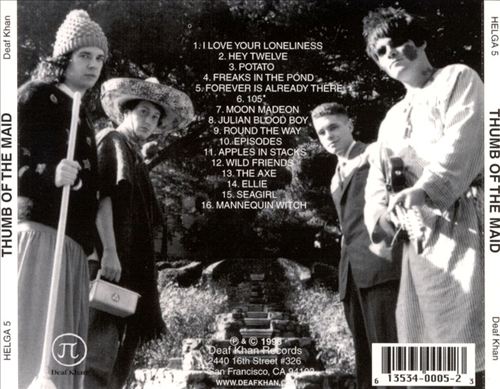 Here’s the thing about Thumb of the Maid and their self-titled album, I know next to nothing about them or the record. I mean, I know it was released by Deaf Khan Records, and that the guys behind it are known as the Moore Brothers. These days they make records under that name, but I’ve listened to a tidbit of the more recent stuff now and then, and nothing is nearly as compelling as the 15 songs on Thumb of the Maid. There are 16 tracks, but I almost always skip the first one, “I Love Your Loneliness” It just doesn’t do it for me and seems to lack the weirdo charm of the rest of the songs. It is just a little too straight, a little too transparently trying to be an American take on 60s Brit Pop in the 90s.