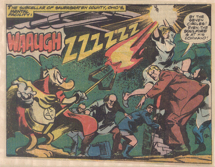 I don’t have a lot to say about 1977’s Howard the Duck #14. It takes off fairly straight forwardly from the end of the previous issue. Now imbued with the dark demon soul of Damien Hellstrom (aka Bronze Age anti-hero Son of Satan) Howard’s dark side takes over. Sure he saves Winda from whatever evil plan the Reverend Yuc and Dr. Reich have in store for her, but he also berates her and slaps her around. Later he hunts down Bev (now back in Cleveland and staying with Paul Same—the artist from Howard the Duck #4 who transformed into Winky Man) and confronts her about their relationship. He belittles her and grabs her wrist painfully twisting her arm to make her kneel down in pain. In that moment he is the worst example of an entitled dude who thinks his own paranoid jealousy and reticence to express emotions aside from anger should be catered to. Thankfully, Damien Hellstrom smashes the devil duck with a car before Bev can be seriously hurt. The actual Son of Satan is able to get his dark soul back and then has to reconstruct Howard’s shattered soul culminating in one of Colan’s dark and lovely two-page spreads. Unfortunately, the age of the comic book copy I own is such that the dark colors are smudged and some of the light text on dark background is illegible because they eschewed caption boxes. Afterwards, Howard the Duck is back to his old self, regaining consciousness as the sun comes up and dismissing this sentimental moment as a “cornball capper.” And he’s right.