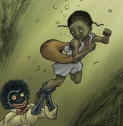 QW: Love’s comic explicitly takes up racial caricatures that have been a staple of American popular culture. He turns the psychic toll of their oppressive “power” into a force that the story’s heroine can interact with and battle against; Sambo and the Golliwog, for example. The comic can be easily mistaken for a children’s story – and too often our most insidious narratives about race start out that way – but Love isn’t afraid to use a child’s perspective to venture into dark places and spin the kinds of tales that we praise writer Zora Neale Hurston for (or bluesman Robert Johnson) by addressing complex social realities through folk imagination.