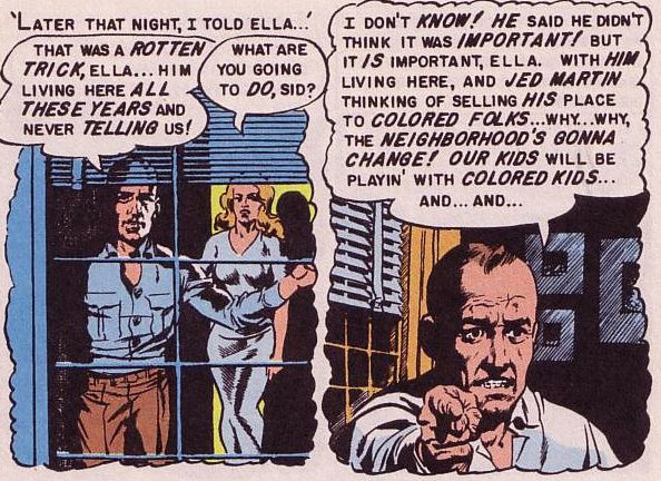 QW: In “Blood Brothers,” from Shock SuspenStories #13 (1953), a white family man named Sid living in the suburbs discovers that his neighbor who also appears to be a white has “Negro blood.” The story follows Sid as he terrorizes the neighbor and makes his life a living hell. The neighbor gets fired from his job, his wife gets sick and can’t get medical attention, his kids are ostracized. So, in the end, the so-called Negro neighbor kills himself.