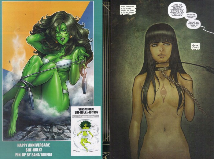 I will say, however, that some of the choices do seem weird, like the inclusion of She-Hulk bondage pin-up by Sana Takeda (who currently does the beautiful and much more sophisticated art on Monstress) meant to evoke the infamous naked She-Hulk jumping rope issue of Sensational She-Hulk (#40) by John Byrne, with its premise that readers were clamoring to see her naked.