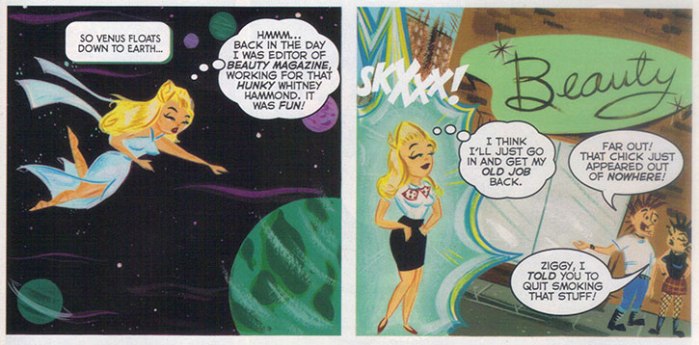 In Girl Comics #1, Stephanie Buscema (John Buscema’s granddaughter) and the legendary Trina Robbins revisit Venus (who most recently appeared in Agents of Atlas) with a call back to her days starring in her own romance comic book in the 1950s. She returns to her old job to discover both how things have changed and how they’ve remained the same for the workplace. Buscema’s art style is very different, not only from the Marvel house style that her grandfather and great-uncle helped shape, but from what you’d find in any superhero books today. It is very painterly in a way that evinces a bright cartoony expressiveness. She also contributes word and pictures to a story featuring the Thing and Human Torch prank-calling Dr.Doom, evoking the playfulness of the Lee/Kirby era of the Fantastic Four.