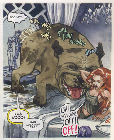 Lucy Knisley’s two-page comic, “Doc Shop,” (Girl Comics #1) presents a sympathetic Dr. Octopus long before Dan Slott ever sought to, and Jill Thompson’s “Dogged Pursuit” in Girl Comics #3—featuring bath time for everybody’s favorite Inhuman, Lockjaw—is cute as heck. Faith Erin Hicks (with the help of Cris Peter on coloring) has Elsa Bloodstone and Boom-Boom (made famous in their appearances in NEXTWave) contemplating turning supervillain in response to the typical attitudes of young men when the latter overhears some talking about how they’d use X-ray vision to spy on unsuspecting girls.