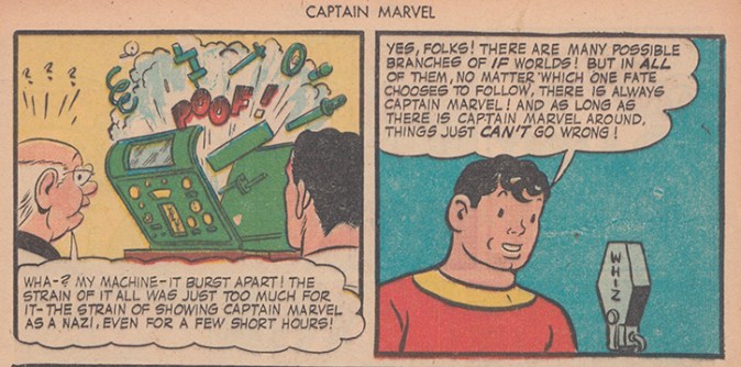 BC: “Captain Marvel in the World of If” is a story in Captain Marvel Adventures #42 (January 1945) about an alternate history where Captain Marvel joins the Nazis—by mistake! At the end of the story, of course, Billy and Captain Marvel save the day from a bunch of Nazi saboteurs who’ve been trying to trick them, but there’s a larger ideology at work in that conclusion, one that Paul Fussell examines in his book Wartime: Understanding and Behavior in the Second World War (1989).