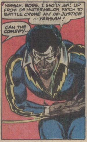 As Green Arrow and Black Lightning continue their fight, the snaps keep coming. GA calls Black Lightning “uppity” and Black Lightning puts on an exaggerated deferential black slave act when joking that he is “up from the watermelon patch to battle crime an’ in-justice. . .yassah!” It is as cringeworthy as it sounds.