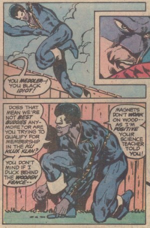 Doctor Polaris calls Black Lightning a “black idiot!” in World’s Finest Comics #260 (January 1980) – art by Netzer and Coletta