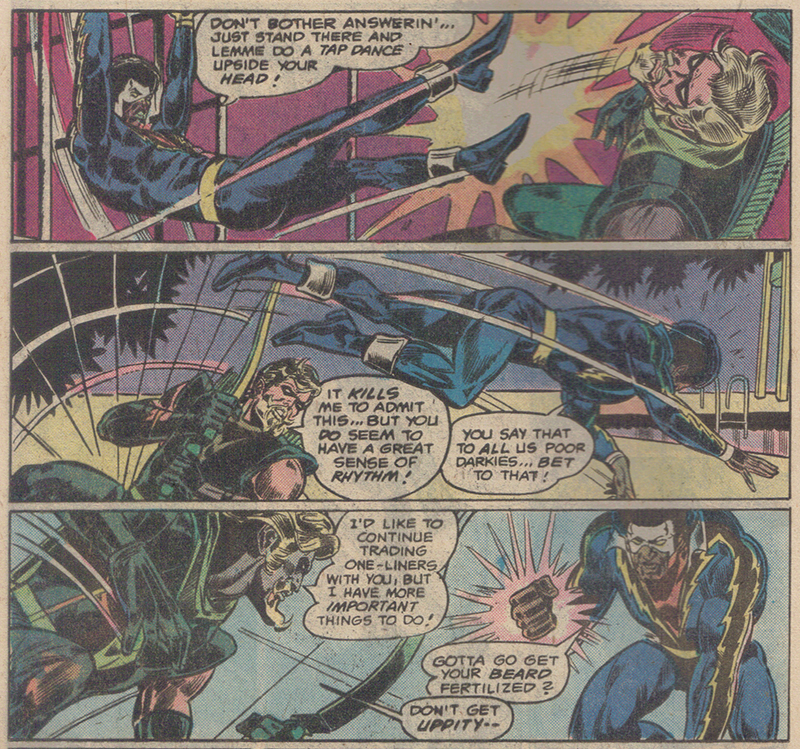 As Green Arrow and Black Lightning continue their fight, the snaps keep coming. GA calls Black Lightning “uppity” and Black Lightning puts on an exaggerated deferential black slave act when joking that he is “up from the watermelon patch to battle crime an’ in-justice. . .yassah!” It is as cringeworthy as it sounds.
