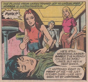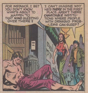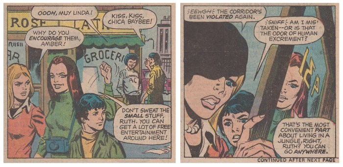 James-Michael definitely doesn’t like it, and for a kid who is well-read, he struggles to understand the complexities of human interaction and social realities of poverty and urban living. From the moment of his arrival, he complains about the noise of the subway, and is astonished about the presence of beggars and public drunks. The comic book is also pretty explicit in its racialized view of the city in a way that does jibe with how poor and working-class brown and black people were seen (and are still seen) in New York City. Amber is catcalled by two young Puerto Rican guys, and it is the only time we see a Latino character or hear any Spanish, despite the city being so diverse and Spanish-speaking people holding all kinds of jobs and having all kinds of interests. Ruth even chastises Amber for “encourag[ing] them,” which is an echo of a scene from Howard the Duck vol. 1 #15 involving Beverly Switzler, and thus leads me to think this was a pet issue for Gerber—that is, that women should be flattered and “not sweat the small stuff.”