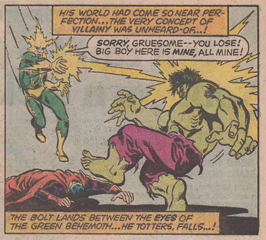 Still, for all this talk about how dangerous Hell’s Kitchen is, the only violence we see in this version of it, is Electro showing up to steal the robot Omega is carrying away from the hospital where it attacked JMS in the previous issue. Later, one of the “winos” that Amber points out to the boy on their way to get his first egg cream (I haven’t had an egg cream in decades!) turns out to actually be Bruce Banner. When he is about to get rolled by local toughs, he transforms into the Hulk. In one way, having shirtless Banner, in tattered purple pants, semi-conscious on the sidewalk is a great image. New York City (especially in the 1970s) is the kind of place where Banner could blend in while in that condition. Most people would leave him alone. The idea that a local bum could actually be someone important who is down on his luck and has a dark secret fits Omega the Unknown’s take on the setting, cleaving to a sense of realism. On the other hand, to have the Hulk suddenly jumping around (having wandered over after the events of Defenders #35), and having Omega fight him, lurches the comic book into the mishegas of the Marvel Universe and its explicatory editorial footnotes. Omega dumps a whole truckload of cars on the emerald behemoth, but it hardly slows him down. Before the fight can finish, however, Electro returns hanging from a helicopter, zaps the Hulk enough to distract him, and kidnaps Omega. It turns out he can’t figure out how to get the robot he stole earlier to work and hopes to force the silent hero to fix it.