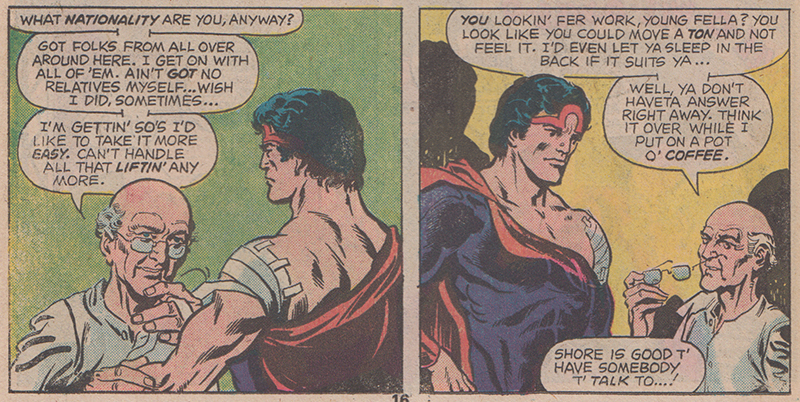Have I mentioned that Omega the Unknown has still not said a word? Omega’s silence seems to work in his favor. When the old man takes him in, he projects his needs onto the stalwart hero, giving Omega work and assuaging his own loneliness in the process. It makes me wonder if Gerber and/or Skrenes were influenced by Carson McCullers’s The Heart is a Lonely Hunter, in which John Singer, a deaf-mute, becomes the silent confidant of several people in his new community.