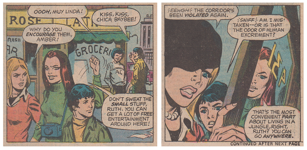 Two panels from Omega the Unknown, vol. 1, #2 that demonstrate how 1970s NYC is represented in these comics.