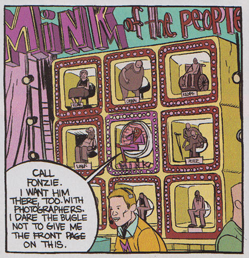I am on the fence about the original Omega’s intersection with the Marvel Universe. The choice of Electro is certainly very strange (the use of the Hulk is better), but part of me worries about the demands of continuity and a shared universe on such a unique book. On the other hand, with judicious use of the familiar setting and characters, Omega the Unknown could uniquely play with the genre and its connection to adolescence (through the figure of James Michael Starling). I guess only my continued reading will see what the writers and artists were able to achieve in such a short time. The Lethem/Rusnak/Dalrymple version remains free of Marvel Universe entanglements, though there is a brief mention of the Daily Bugle. Still, while unlike the original comic, the re-imagining does not seem to have the Marvel characters to play with, it nevertheless comments on the superhero genre through the Mink, whose failed banter pokes fun at comic book tropes, and at one point the cynical “hero” is depicted hosting his own version of Hollywood Squares called “Mink of the People.”
